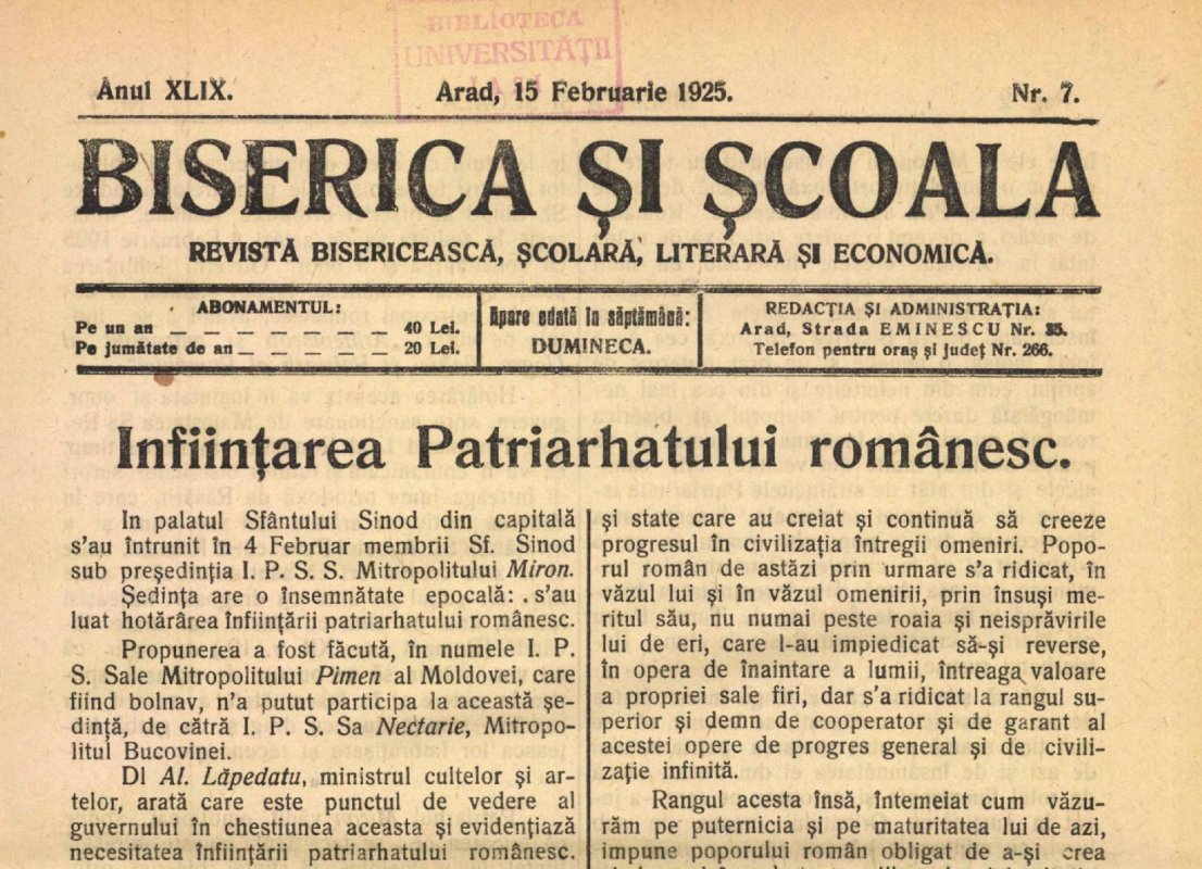 Să vedem cum este prezentată înfiinţarea Patriarhiei Române într-o revistă cu profil religios care apare la Arad. Este vorba de Biserica şi Şcoala, „revistă bisericească, şcolară, literară şi economică“. În ediţia săptămânală din data de 15 februarie 1925, primele două pagini sunt dedicate prezentării în detaliu a evenimentului din 4 februarie 1925. Articolul poartă titlul „Înfiinţarea Patriarhatului Românesc” şi are ca intertitlu „Actul de înfiinţare a Patriarhatului Românesc”, în care sunt prezentate etapele ridicării Bisericii Ortodoxe Române la rang de Patriarhie, în şedinţa Sfântului Sinod din 4 februarie 1925.