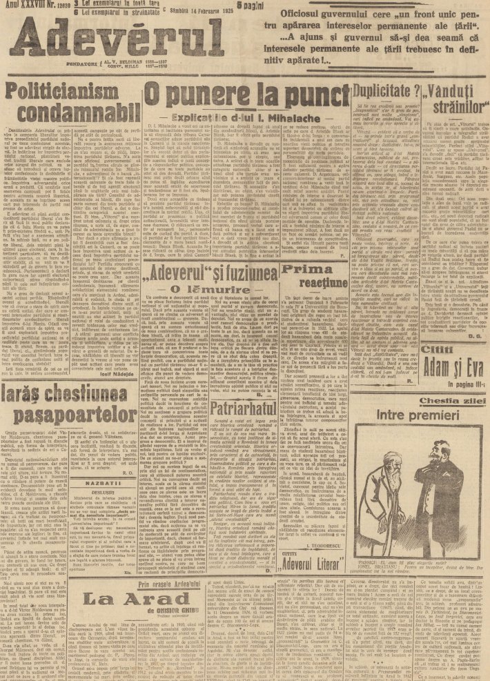 O altă publicaţie importantă a epocii, „Adevărul”, în ediţia sa de sâmbătă, 14 februarie 1925, titra pe prima pagină: „Patriarhatul”. Textul ne spune că „Biserica ortodoxă română era virtualmente, prin caracterul ei de autocefală, în drepturile şi situaţia patriarhiei. Însemnătatea politică pe care a dobândit-o România prin întregirea naţională şi prin noile raporturi cu celelalte biserici, reprezentate în credinţa noilor cetăţeni ai statului, a impus transpunerea şi în formă a unei stări de fapt. Patriarhatul român nu are o tradiţie religioasă, dar are desigur una politică”.