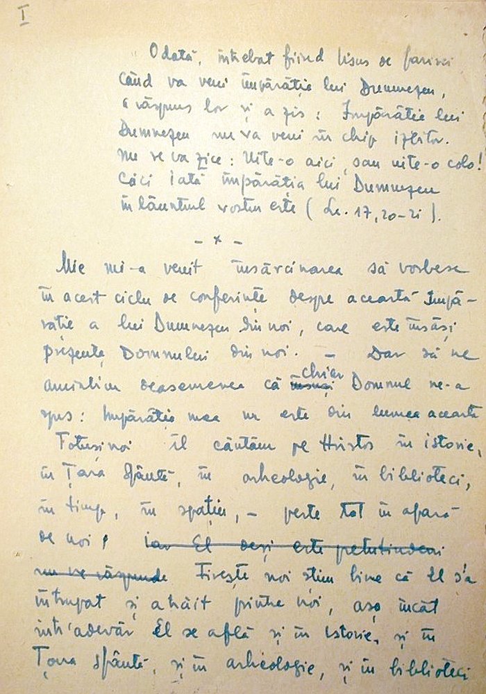 «Mie mi-a venit însărcinarea să vorbesc în acest ciclu de conferințe despre Împărăția lui Dumnezeu din noi, care este însăși prezența Domnului din noi. Dar să ne amintim, de asemenea, că chiar Domnul ne-a spus: Împărăția mea nu este din lumea aceasta.