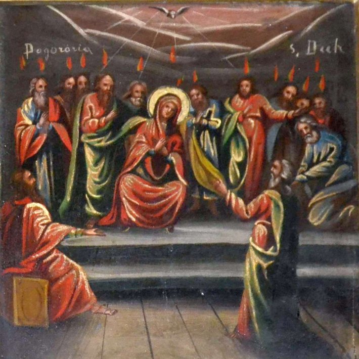 Am descoperit interesante reprezentări ale Pogorârii Sfântului Duh și în bisericuțele de lemn moldovenești. În unele bisericuțe, Pogorârea Sfântului Duh este pictată într-un stil naiv, în mijlocul Apostolilor apărând Maica Domnului. „Prezența Maicii Domnului în iconografia Pogorârii Duhului Sfânt nu este tradițională. Nu apare în iconografia veche, medievală. A fost o perioadă în care a fost introdusă Maica Domnului la Pogorârea Duhului Sfânt, există biserici la noi, din perioada respectivă și chiar în secolul XX, în care s-au pictat compoziții de acest fel. Ar trebui să înțelegem această iconografie prin prisma dragostei poporului pentru Maica Domnului”, consideră părintele Gabriel Herea. Am identificat astfel de scene pe catapetesmele multor biserici de lemn, dar ilustrative mi s-au părut cele observate la Curița și la Merișor-Scorțeni, în județul Bacău, și la Suharău, în județul Botoșani.