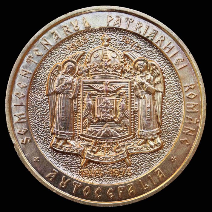 A cincea medalie (foto 9, 10), de dimensiuni ceva mai mari (circumferința de 69 mm și grosimea de 5 mm), bătută în bronz aurit, a fost emisă în 1975 cu ocazia unui eveniment marcant din viața Bisericii Ortodoxe Române: împlinirea a 50 de ani de la ridicarea Bisericii noastre la rang de Patriarhie și, totodată, împlinirea a 90 de ani de la dobândirea Autocefaliei. Pe avers este reprezentat bustul Patriarhului Justinian purtând camilafcă, două engolpioane, cruce și baston, fiind gravat textul: Biserica Ortodoxă Română. Preafericitul Patriarh Justinian. Tot aici găsim menționat numele de familie întreg al aceluiași renumit gravor H(aralambie) Ionescu. Mențiunea aceasta este importantă deoarece arată că artistul a fost în activitate până la sfârșitul vieții. Pe avers este gravată stema Patriarhiei Române, în partea ei superioară fiind menționați anii 1925-1975, iar în cea inferioară 1885-1975; textul care înconjoară stema este acesta: Semicentenarul Patriarhiei Române. Autocefalia; el amintește, ca și anii respectivi, de cele două evenimente aniversate (MPIR, p. 375, nr. 3142).