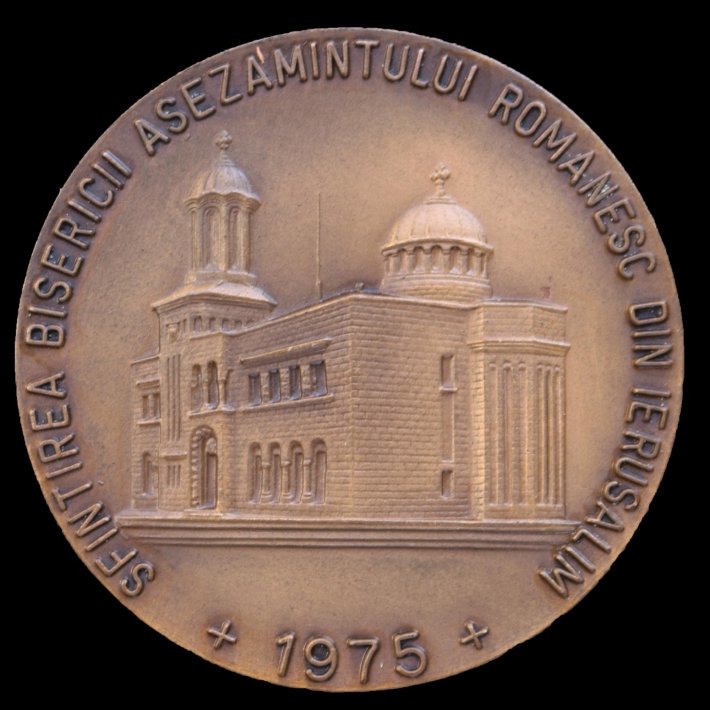 A șasea medalie (foto 11, 12) a fost bătută în bronz, tot în 1975, cu ocazia Sfințirii bisericii Așezământului românesc din Ierusalim (MPIR, p. 375, nr. 3143) săvârșită de însuși Patriarhul Justinian. Precizăm că, deși această medalie prezintă aceleași gravuri cu cele ale ediției din 1970, emise pentru a marca sfințirea Așezămintelor românești din Țara Sfântă, pentru realizarea acestei a șasea medalii a fost întocmit un nou proiect de către gravorul H. Ionescu. Această piesă are dimensiunile ușor mărite (circumferința de 60 mm și grosimea de 5 mm), iar fonturile sunt diferite de cele din 1970. Așadar, pe avers este gravat portretul Patriarhului Justinian, purtând camilafcă, două engolpioane, cruce și baston, cu textul: Preafericitul Justinian, Patriarhul României. Tot aici găsim și inițialele artistului H(aralambie) I(onescu). Pe revers este gravată clădirea Așezământului românesc de la Ierusalim cu textul: Sfințirea bisericii Așezământului românesc din Ierusalim. 1975. Și această medalie este rară.
