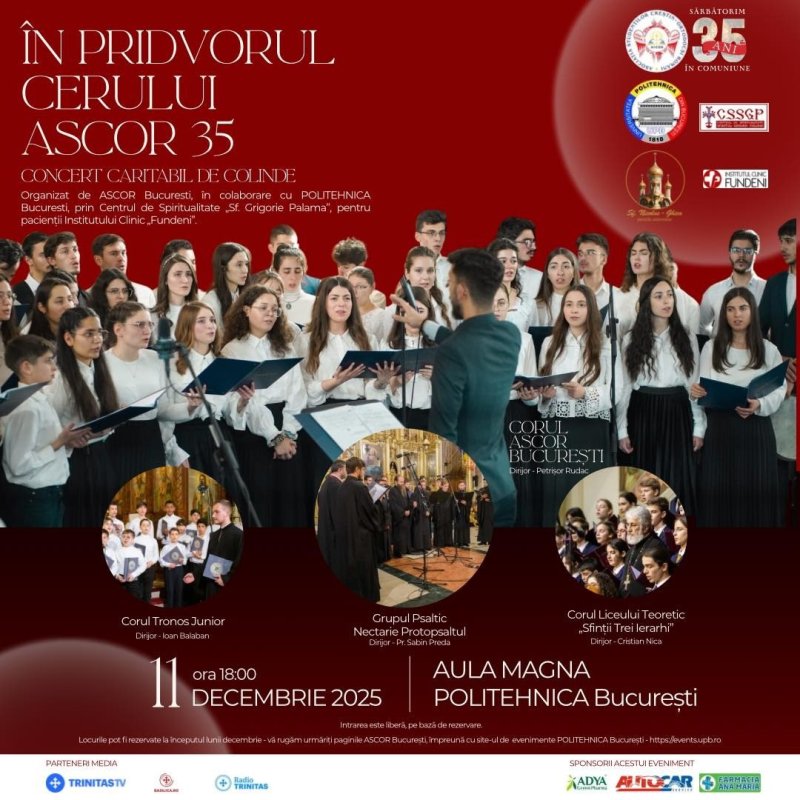 Asociația Studenților Creștin-Ortodocși Români (ASCOR), împreună cu Universitatea Politehnica din București, prin intermediul Centrului de spiritualitate „Sfântul Grigorie Palama”, organizează un concert caritabil de colinde intitulat: „Sub pridvorul cerului. ASCOR 35”, care va avea loc joi, 11 decembrie 2025, de la ora 18:00, în Aula Magna a Politehnicii. Evenimentul marchează 35 de ani de activitate a ASCOR, oferind publicului o seară de sărbătoare, în care frumusețea colindelor tradiționale și a muzicii religioase va îmbrăca sălile universității într-o atmosferă de bucurie și comuniune. Pe scena concertului vor urca: corul Liceului Teoretic „Sfinții Trei Ierarhi”, dirijat de Cristian Nica; Grupul psaltic „Tronos Junior”, dirijat de psaltul Ioan Balaban; Grupul psaltic „Nectarie Protopsaltul”, condus de părintele diac. Sabin Preda, și corul ASCOR București, sub bagheta dirijorului Petrișor Rudac.