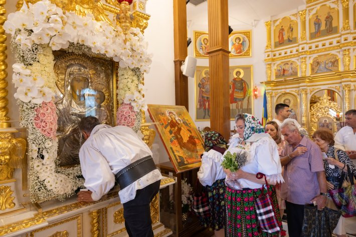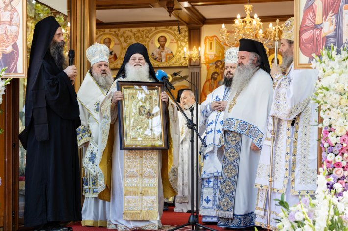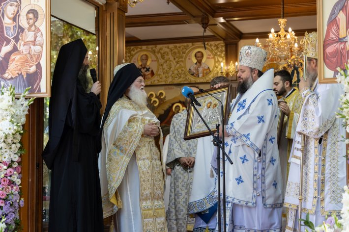 În continuare, părintele stareț Efrem Vatopedinul a mulțumit pentru găzduire și a adresat cuvinte de binecuvântare credincioșilor: „Simt multă bucurie că sunt prezent aici, slujind împreună Sfânta Liturghie, Taina Sfintei Euharistii fiind comuniunea Bisericii. Așa cum spune și Sfântul Nicolae Cabasila, Biserica se găsește în Taine. Din acest motiv, această zi este importantă pentru noi toți, deoarece o prăznuim pe Maica Domnului «Prodromița», fiind o icoană nefăcută de mână omenească, ce este atât un reper duhovnicesc pentru monahii români din Sfântul Munte Athos, cât și pentru dumneavoastră, prin copia ei aflată aici”, a spus starețul Efrem Vatopedinul.