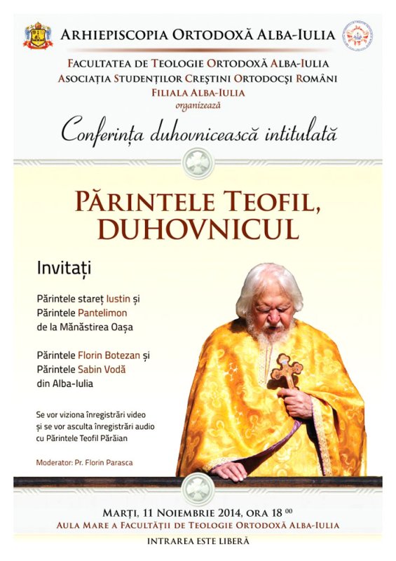 ASCOR Alba Iulia organizează, azi, de la ora 18:00, în Aula „Dumitru Stăniloae“ a Facultăţii de Teologie Ortodoxă din Alba Iulia, conferinţa cu tema „Părintele Teofil Duhovnicul“. Invitaţii acestei întâlniri sunt stareţul Iustin Miron şi părintele Pantelimon Şuşnea de la Mănăstirea Oaşa, judeţul Alba, pr. Florin Botezan şi pr. Sabin Vodă din Alba Iulia. Conferinţa va cuprinde mărturii despre părintele Teofil Părăian, duhovnicul Mănăstirii „Brâncoveanu de la Sâmbăta de Sus, judeţul Braşov. Vor fi prezentate înregistrări video şi audio cu Părintele Teofil.