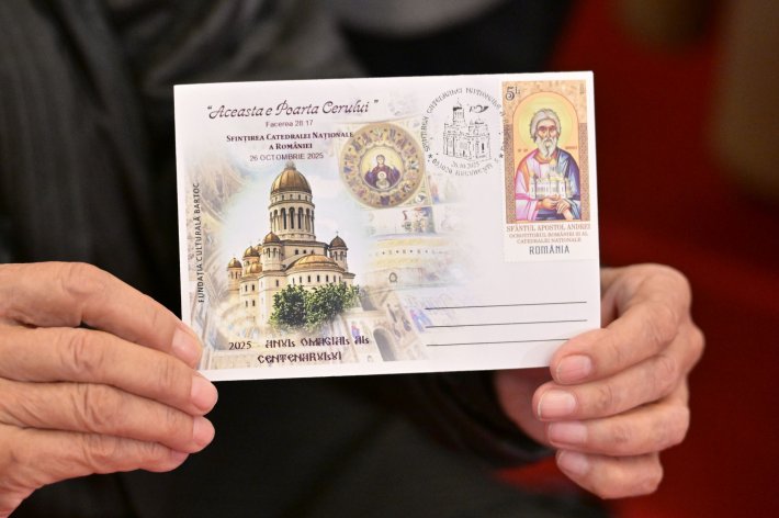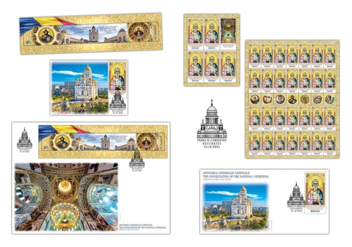 De asemenea, o emisiune filatelică dedicată sfințirii Catedralei Naționale a fost pusă în circulație vineri, 24 octombrie, de Romfilatelia și Poșta Română, informează site-ul romfilatelia.ro. Emisiunea conține o marcă poștală, o coliță dantelată, două plicuri „prima zi” și o carte poștală maximă pentru pasionații de maximafilie. Potrivit sursei citate, marca poștală a emisiunii, cu valoarea nominală de 5 lei, reproduce imaginea unei icoane din mozaicul catapetesmei Catedralei Naționale ce îl înfățișează pe Sfântul Apostol Andrei, Ocrotitorul României. Marca poștală cu dimensiunile de 252×36 mm a coliței filatelice, cu valoarea nominală de 30 de lei, reproduce o amplă panoramă a spațiului în care este zidită Catedrala, flancată de două imagini cu icoane ale Mântuitorului Iisus Hristos și Maicii Domnului. Această marcă are dimensiuni care le depășesc pe cele ale ultimului record filatelic publicat de Cartea Recordurilor Mondiale. Plicul „prima zi” al emisiunii este realizat în două variante grafice, unul echipat cu timbrul emisiunii, alături de ilustrația panoramică a Catedralei Naționale, iar al doilea, cu o grafică de detaliu a iconografiei plafonului Catedralei, echipat cu colița dantelată a emisiunii.