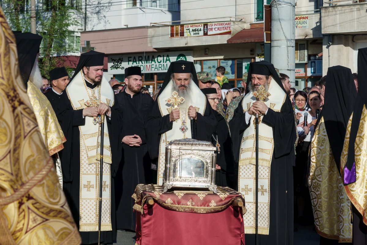 În cadrul Sfintei Liturghii, Preasfințitul Părinte Veniamin a adresat credincioșilor prezenți un cuvânt de învățătură în care a evidențiat ce au în comun Sfântul Gheorghe Pelerinul, ale cărui moaște au fost purtate în procesiune pe străzile orașului, marți, 22 aprilie, și Sfântul Mare Mucenic Gheorghe, ocrotitorul spiritual al Botoșaniului: „Ce au comun cei doi sfinți? Mai întâi, amândoi L-au mărturisit pe Hristos cu toată puterea și ființa lor și nu au ținut cont de cei care erau în fața lor și care, în anumite împrejurări, au încercat să îi readucă ca să fie lumești, să se asemene cu lumea aceasta. Al doilea lucru pe care îl vedem că-l au comun este rugăciunea pe care ei o făceau în fața lui Dumnezeu, pentru că rugăciunea este vorbirea noastră cu Dumnezeu. Pe măsura în care noi vorbim cu Dumnezeu, primim har peste har și facem lucrător harul Botezului, facem ca lucrarea lui Dumnezeu să se întipărească în ființa noastră, iar noi să dobândim asemănarea cu Dumnezeu. Pentru că am fost creați de Dumnezeu după chipul Lui, ca să dobândim asemănarea pe care o facem prin dobândirea harului Duhului Sfânt. Un alt lucru pe care îl au comun cei doi sfinți pe care îi avem astăzi aici și îi cinstim, pe Sfântul Gheorghe, a cărui prăznuire o facem, și Sfântul Gheorghe Pelerinul, este mărturisirea lui Hristos până la sfârșitul vieții. E foarte important ca noi să rămânem statornici ca și credincioși și, mai mult decât atât, să chemăm pe Dumnezeu, să îi chemăm pe sfinții noștri ocrotitori, ca ei să ne păzească pe calea vieții, să ne călăuzească pașii spre Hristos, să ne fie modele și, în același timp, rugători înaintea Tronului Preasfintei Treimi”.