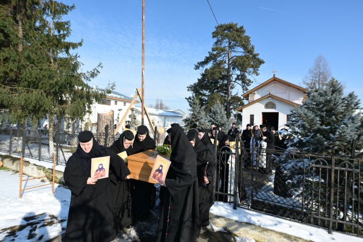 Sicriul ce va adăposti cinstitele oseminte ale Sfintei Cuvioase Mucenițe Evloghia până la așezarea lor în raclă a fost purtat de către maici, pe urmă, în biserica din cimitirul mănăstirii, unde a fost rostită o rugăciune încununată de intonarea troparului sfintei.