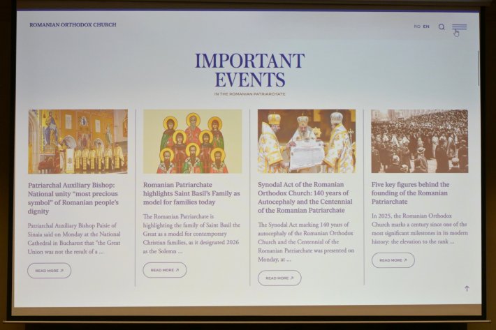 În continuare, arhimandritul Augustin Coman, consilier patriarhal, a prezentat varianta în limba engleză a site-ului oficial al Patriarhiei Române, patriarhia.ro: „Dacă la începutul Anului Centenar lansam varianta în limba română a site-ului Patriarhiei Române, iată că acum, la finalul lui, avem bucuria de a lansa și varianta în limba engleză. Acesta nu este un demers pur administrativ sau tehnic, ci exprimă deschiderea Bisericii Ortodoxe Române față de societate, mai ales în lumea contemporană în care comunicarea depășește granițele geografice și culturale. Biserica Ortodoxă Română a fost întotdeauna întemeiată în viața poporului român, dar a rămas în același timp deschisă celorlalte Biserici, confesiuni și culturi. În acest context, limba engleză reprezintă pentru noi un instrument de a face și mai bine cunoscute informațiile despre viața și activitatea misionară și pastorală a Bisericii Ortodoxe Române. La nivel de conținut, informațiile au un caracter static, pentru a nu dubla ceea ce Agenția de știri BASILICA face deja, anume traduce în engleză cele mai importante știri din Patriarhia Română. Sunt informații cu privire la structura și organizarea Patriarhiei Române, despre Preafericitul Părinte Patriarh Daniel și despre Patriarhii anteriori, istoria Patriarhiei Române și așa mai departe. Modul de a accesa această variantă în limba engleză a site-ului se face de pe versiunea în limba română”.