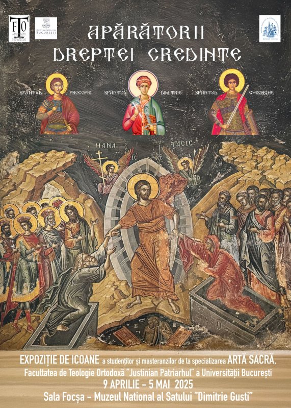 Studenții și masteranzii de la specializarea Artă Sacră din cadrul Departamentului de teologie sistematică, practică și artă sacră al Facultății de Teologie Ortodoxă din București organizează în perioada 9 aprilie - 5 mai 2025 o expoziție de icoane, intitulată „Apărătorii Dreptei Credințe”. Vernisajul expoziției are loc miercuri, 9 aprilie, de la ora 14:00 în Sala „Gheorghe Focșa” a Muzeului Național al Satului „Dimitrie Gusti”.