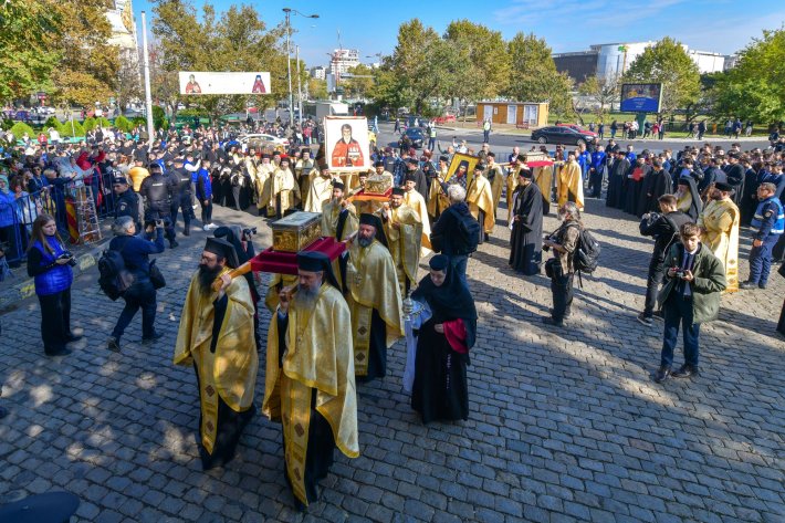 Au participat cadre teologice universitare, monahi și monahii. Pe tot parcursul procesiunii, alături de diaconii și arhidiaconii cu cădelnițe, au tămâiat și monahiile raclele cu cinstitele moaște. Tot drumul a fost înfrumusețat de cântările bisericești ale Grupului psaltic „Tronos” al Catedralei Patriarhale, condus de arhidiaconul Mihail Bucă, iar credincioșii și pelerinii au înălțat rugăciuni fierbinți.