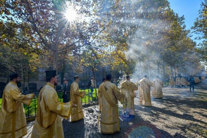 Prima coloană de slujitori și credincioși a pornit la ora 12:00 de la Catedrala Patriarhală și a fost condusă de Preasfințitul Părinte Paisie Sinaitul, Episcop-vicar patriarhal. Clericii au purtat înainte icoana și racla cu moaștele Sfântului Cuvios Dimitrie cel Nou, Ocrotitorul Bucureștilor, precum și racla cu fragmente din moaștele Sfântului Mare Mucenic Dimitrie, Izvorâtorul de Mir. Din alaiul procesional au făcut parte clerici de la Protopopiatele Sector 4, 5 și 6 Capitală și din Protoieria Ilfov Sud, precum și preoții de caritate, de la cimitire, de la unitățile militare și de la unități de învățământ, monahi, monahii și numeroși credincioși. În sunet de clopote și cântări duhovnicești și în miros bineplăcut de tămâie, clericii și credincioșii au coborât Colina Bucuriei, pe strada Patriarhiei, înaintând pe bulevardul Regina Maria și ajungând la baza Dealului Patriarhiei.