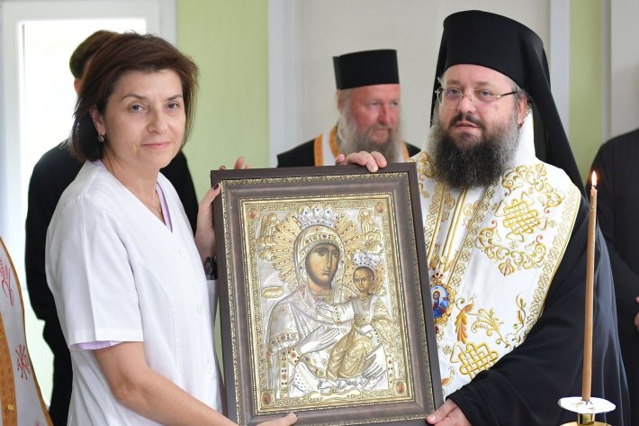 În semn de prețuire pentru întreaga activitate depusă pentru alinarea suferinței copiilor suferinzi, Preasfinția Sa a oferit instituției medicale, din partea Întâistătătorului Bisericii noastre, o icoană cu chipul Maicii Domnului cu Pruncul, iar tuturor celor prezenți iconițe cu chipul Mântuitorului - Păstorul cel Bun.
