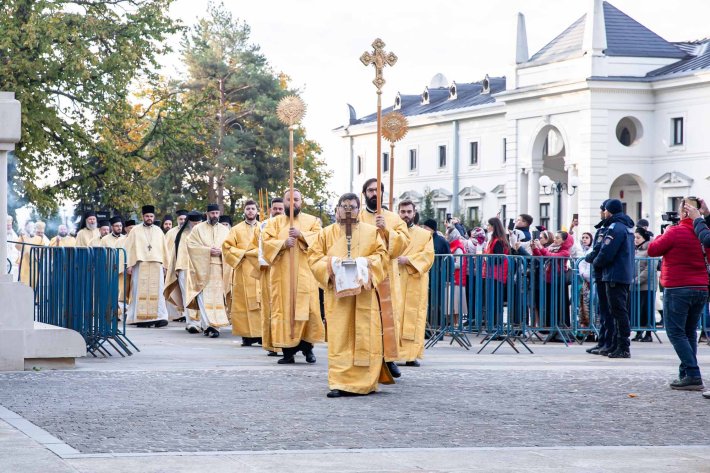 Sfânta Liturghie, momentul central al pelerinajului, a fost săvârșită astăzi, 14 octombrie, pe podiumul special amenajat la limita cu Pietonalul Ștefan cel Mare și Sfânt, în dreptul Altarului Catedralei Mitropolitane, de un sobor de 27 de ierarhi, preoți și diaconi, atât din țară, cât și din străinătate.