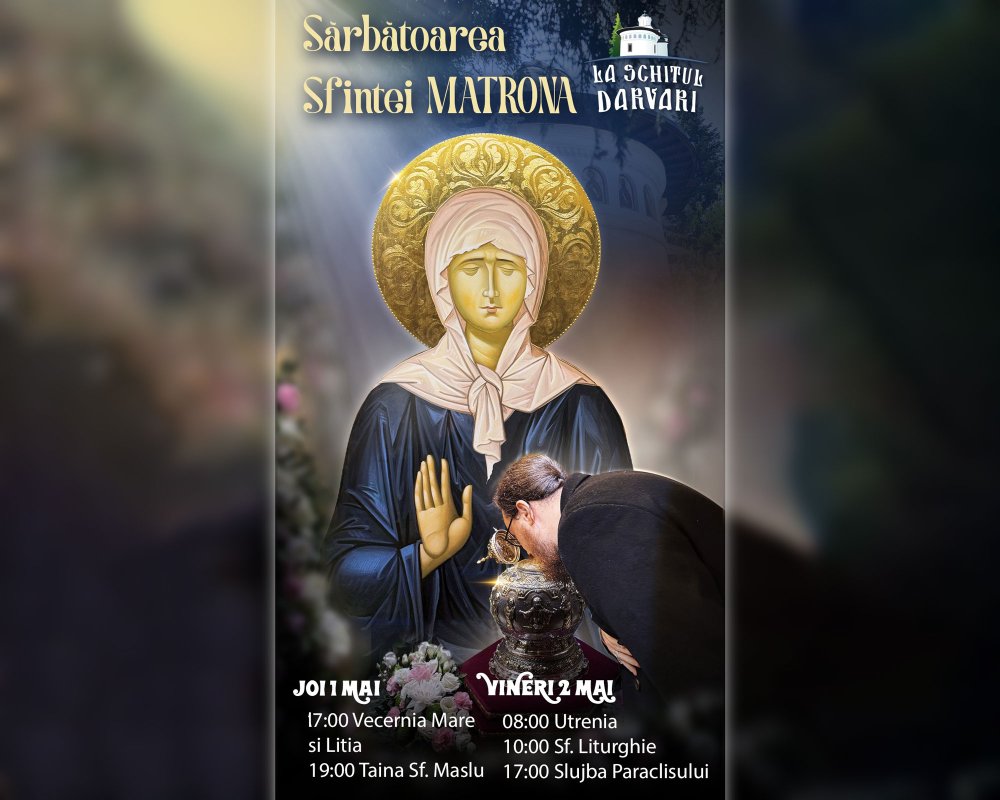 Vineri, 2 mai, Biserica Ortodoxă face pomenirea Sfintei Matrona de la Moscova. Cu acest prilej, un program liturgic special va avea loc la Schitul Darvari din sectorul 2 al Capitalei, întrucât așezământul monahal găzduiește o frumoasă icoană a sfintei și un fragment din cinstitele sale moaște, primit în dar în prima parte a acestei luni.