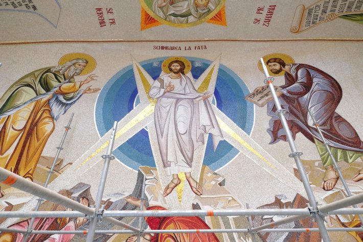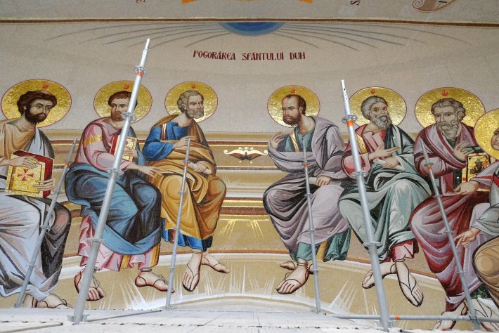 „Acum lucrăm în zona pronaosului, unde mai avem de aplicat câteva scene din viața Maicii Domnului, o icoană foarte mare pe boltă cu Maica Domnului Oranta înconjurată de un sobor de 16 îngeri, apoi Sfânta Mahramă care vine pe arcul despărțitor dintre naos și pronaos, pe care vrem să o aplicăm până la data respectivă. Într-o perspectivă mai îndepărtată, pentru aplicarea în catedrală după data de 1 septembrie, lucrăm în ateliere momentan la icoanele sfinților români canonizați în acest An Centenar, care vor fi amplasate pe pilaștrii din pronaos. Părțile cele mai vizibile și cele mai importante din catedrală, adică turla Pantocrator, absidele laterale, Altarul cu arcul triumfal, arcul despărțitor dintre naos și pronaos sunt finalizate și sperăm ca până la momentul sfințirii să fie gata și cât mai mult din bolta pronaosului. Toate spațiile care rămân nepictate vor fi acoperite cu bannere care ilustrează proiectele ce vor fi ulterior realizate și care vor arăta o prefigurare a viitorului mozaic”, a declarat pentru Radio TRINITAS pictorul Daniel Codrescu.