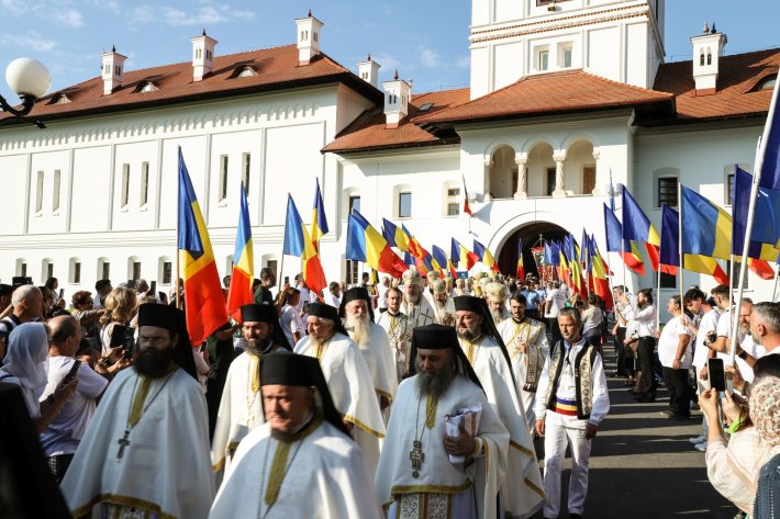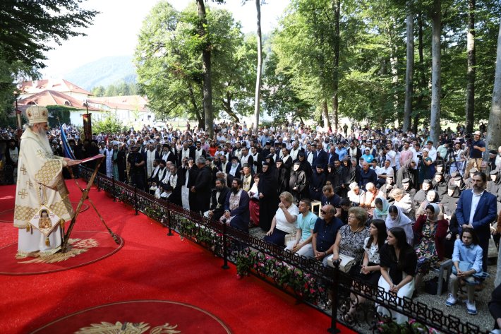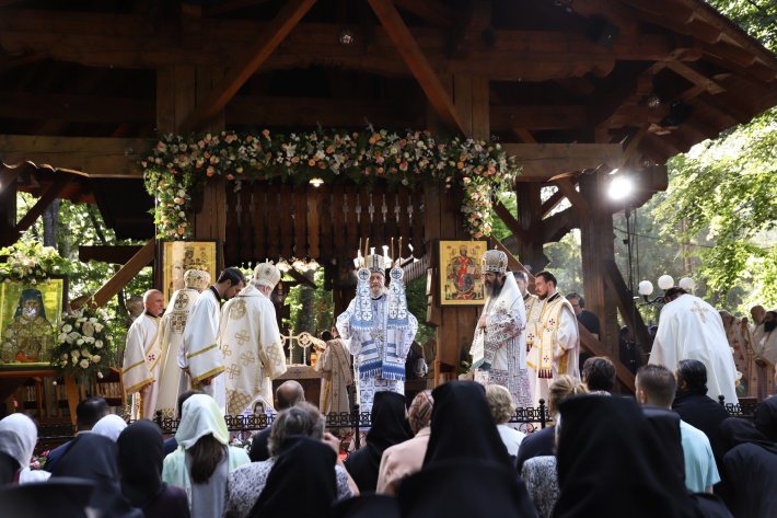 Sfânta Liturghie a fost săvârşită la Altarul de vară din pădure al mănăstirii de către Înaltpreasfinţitul Părinte Teofan, Mitropolitul Moldovei şi Bucovinei, împreună cu Înaltpreasfinţitul Părinte Laurenţiu, Mitropolitul Ardealului; Înaltpreasfinţitul Părinte Irineu, Mitropolitul Olteniei; Înaltpreasfinţitul Părinte Iosif, Mitropolitul ortodox român al Europei Occidentale şi Meridionale; Înaltpreasfinţitul Părinte Serafim, Mitropolitul ortodox român al Germaniei, Europei Centrale şi de Nord; Înaltpreasfinţitul Părinte Atanasie, Arhiepiscopul ortodox român al Marii Britanii și Irlandei de Nord; Preasfinţitul Părinte Ignatie, Episcopul Huşilor; Preasfinţitul Părinte Lucian, Episcopul Caransebeșului; Preasfinţitul Părinte Nicodim, Episcopul Severinului și Strehaiei; Preasfinţitul Părinte Antonie, Episcopul de Bălți; Preasfinţitul Părinte Veniamin, Episcopul Basarabiei de Sud; Preasfinţitul Părinte Andrei, Episcopul Covasnei şi Harghitei; Preasfinţitul Părinte Galaction, Episcopul Alexandriei și Teleormanului; Preasfinţitul Părinte Benedict, Episcopul Sălajului; Preasfinţitul Părinte Nestor, Episcopul Devei şi Hunedoarei; Preasfinţitul Părinte Ieronim, Episcopul Daciei Felix; Preasfinţitul Părinte Siluan, Episcopul ortodox român din Ungaria; Preasfinţitul Părinte Siluan, Episcopul ortodox român al Italiei; Preasfinţitul Părinte Macarie, Episcopul ortodox român al Europei de Nord; Preasfinţitul Părinte Nectarie, Episcopul ortodox român al Irlandei și Islandei; Preasfinţitul Părinte Ilarion Făgărășanul, Episcop-vicar al Arhiepiscopiei Sibiului; Preasfinţitul Părinte Damaschin Dorneanul, Episcop-vicar al Arhiepiscopiei Sucevei și Rădăuților; Preasfinţitul Părinte Emilian Crişanul, Episcop-vicar al Arhiepiscopiei Aradului, şi Preasfinţitul Părinte Gherontie Hunedoreanul, Arhiereu-vicar al Episcopiei Devei şi Hunedoarei.