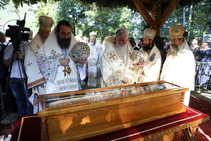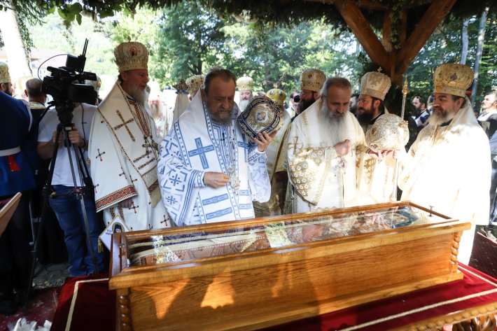 Racla cu moaştele Sfântului Cuvios Serafim cel Răbdător a fost adusă în procesiune din biserica mănăstirii şi aşezată într-un baldachin din apropierea Altarului de vară din pădure, pentru ca mulţimile de pelerini să aibă posibilitatea să aducă cinstire noului ocrotitor al aşezământului monahal.