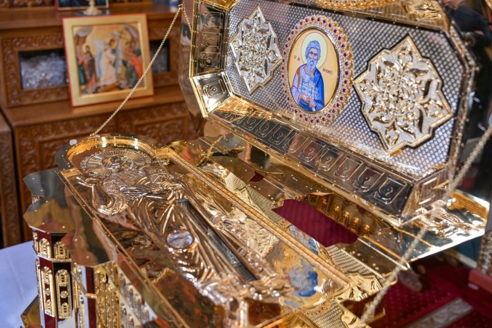 Preafericirea Sa a explicat că racla ce adăpostește cinstitele odoare va fi așezată permanent spre închinare în noul lăcaș de rugăciune: „Această raclă are chiar forma catedralei și ea va fi permanent prezentă în sfântul lăcaș. Racla imită Catedrala Națională până la cornișe, iar mai sus de acestea, în loc de turle se află capacul ei. Pe capac este chipul Sfântului Apostol Andrei, iar în interiorul capacului se află icoana Sfântului Andrei care poartă pe brațele sale Catedrala Națională, fiind și ocrotitor al acesteia. Moaștele pe care le avem în această raclă sunt donate. Primul fragment a fost oferit de Episcopia Ortodoxă Română a Italiei. În data de 27 noiembrie a anului trecut, Preasfințitul Părinte Episcop Siluan a adus un fragment din moaștele Sfântului Apostol Andrei, anume peroneul de la piciorul său drept, în lungime de 33 cm, fiind cea mai mare parte pe care o avem din aceste cinstite moaște. În data de 28 ianuarie a acestui an, o delegație a Patriarhiei Române, formată din Preasfințitul Părinte Siluan, părintele arhimandrit Andrei Anghel, vicar patriarhal, și părintele prof. dr. George Grigoriță, a primit din partea Arhiepiscopului Orazio Soricelli de Amalfi-Cava de’Tirreni, din Italia, rotula de la piciorul drept al Sfântului Apostol Andrei. Cele două fragmente din moaștele Sfântului Andrei se află, deci, în această raclă”.