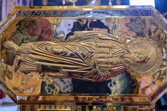 Racla din argint aurit, în care au fost așezate fragmente din sfintele moaște ale Ocrotitorului României, a fost măiestrit lucrată la Atelierele Patriarhiei Române, fiind împodobită cu icoane ale sfântului și cu alte ornamente.