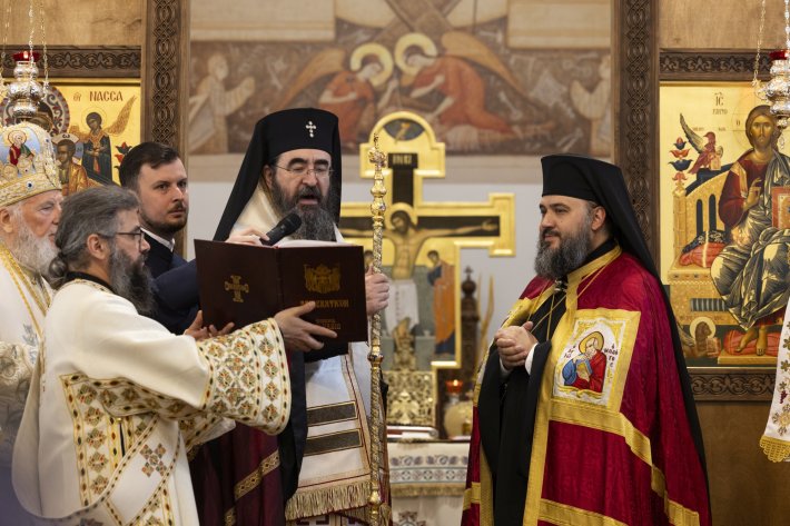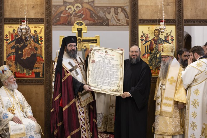 IPS Părinte Mitropolit Iosif i-a oferit apoi Arhiepiscopului Atanasie însemnele slujirii chiriarhale: mantia, cruce pectorală şi engolpion, camilafca şi cârja arhierească, după care l-a aşezat în tronul arhieresc. Toţi cei prezenţi au cântat „Vrednic este!” şi au intonat pentru prima dată imnul arhieresc.