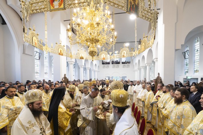 În ziua de pomenire a Sfântului Apostol Simon Zilotul şi a Sfântului Cuvios Calistrat de la Timişeni şi Vasiova, noua Catedrală „Sfântul Mare Mucenic Gheorghe”, amenajată în ultimii ani într-o biserică istorică din Enfield, a găzduit sărbătoarea mult-aşteptată de comunitatea românească din Regatul Unit. Sfânta Liturghie a fost săvârşită de Înaltpreasfinţitul Părinte Iosif, Mitropolitul ortodox român al Europei Occidentale şi Meridonale împreună cu Înaltpreasfinţitul Părinte Siluan, Mitropolitul ortodox antiohian al Insulelor Britanice şi Irlandei; Înaltpreasfinţitul Părinte Nifon, Arhiepiscopul Târgoviştei, Mitropolit onorific şi Exarh patriarhal; Înaltpreasfinţitul Părinte Andrei, Arhiepiscopul ortodox georgian al Marii Britanii şi Irlandei; Preasfinţitul Părinte Ignatie, Episcopul Huşilor; Preasfinţitul Părinte Veniamin, Episcopul Basarabiei de Sud; Preasfinţitul Părinte Siluan, Episcopul ortodox român al Italiei; Preasfinţitul Părinte Timotei, Episcopul ortodox român al Spaniei şi Portugaliei; Preasfinţitul Părinte Ioan Casian, Episcopul ortodox român al Canadei; Preasfinţitul Părinte Nectarie, Episcopul ortodox român al Irlandei şi Islandei; Preasfinţitul Părinte Atanasie, Arhiepiscopul ortodox român ales al Marii Britanii şi Irlandei de Nord; Preasfinţitul Părinte Maxim de Melitina, Episcop-vicar al Arhiepiscopiei Ortodoxe Greceşti a Thyateirei şi Marii Britanii; Preasfinţitul Părinte Marc Nemţeanul, Episcop-vicar al Arhiepiscopiei Ortodoxe Române a Europei Occidentale; Preasfinţitul Părinte Damaschin Dorneanul, Episcop-vicar al Arhiepiscopiei Sucevei şi Rădăuţilor; Preasfinţitul Părinte Teofil de Iberia, Arhiereu-vicar al Episcopiei Ortodoxe Române a Spaniei şi Portugaliei, înconjuraţi de un ales sobor de preoţi şi diaconi, în prezenţa clericilor români din întreaga eparhie şi din mitropolie.
