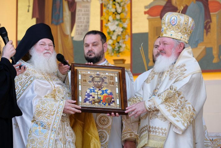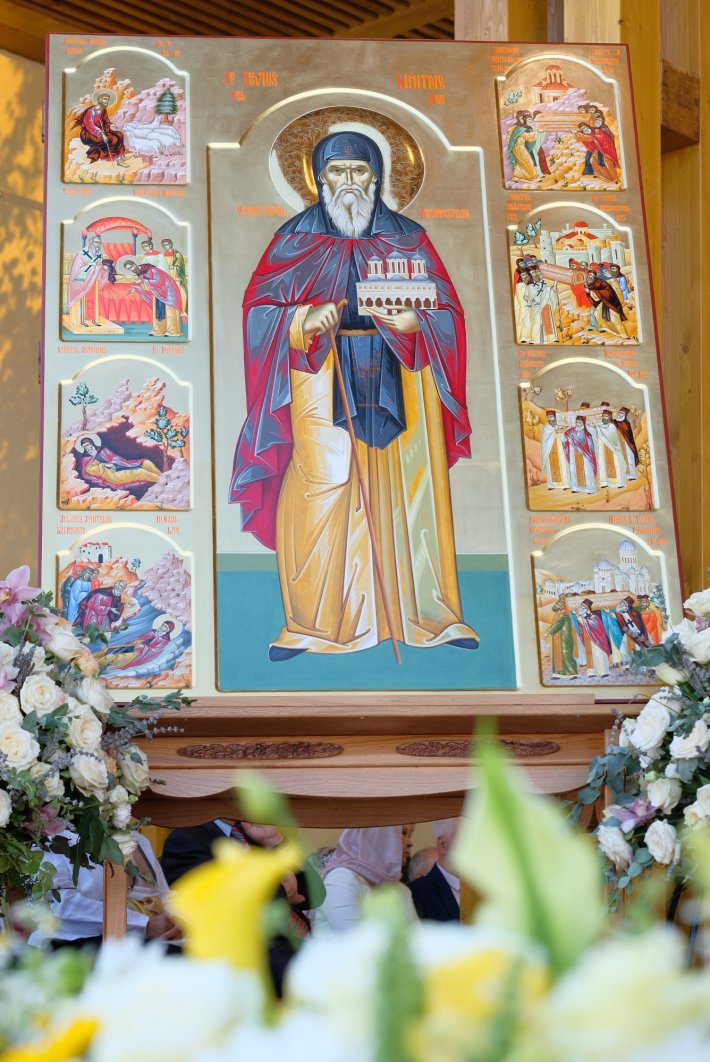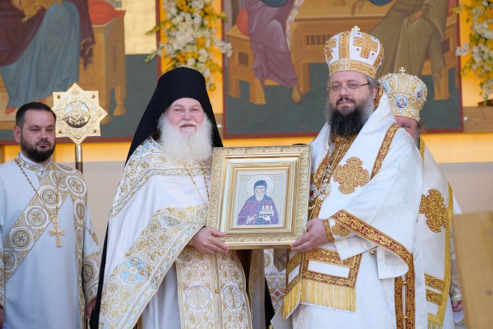 La finalul Sfintei Liturghii, Preasfințitul Părinte Paisie Sinaitul i-a oferit părintelui Efrem, din partea Preafericitului Părinte Patriarh Daniel, o icoană cu chipul Sfântului Cuvios Dimitrie cel Nou, Ocrotitorul Bucureștilor, în semn de prețuire și binecuvântare față de obștea vatopedină. „Ne rugăm cu smerenie Sfântului Cuvios Dimitrie cel Nou, Ocrotitorul Bucureștilor, cel care a trăit în rugăciune, smerenie și tăcere, să vă întărească, să vă lumineze și să vă sprijine în tot ceea ce faceți cu jertfelnicie și discernământ, mai ales în aceste vremuri pline de încercări și tulburări. Vă mulțumim încă o dată pentru dragostea și susținerea dumneavoastră și vă dorim din inimă mulți și binecuvântați ani”, a spus ierarhul.