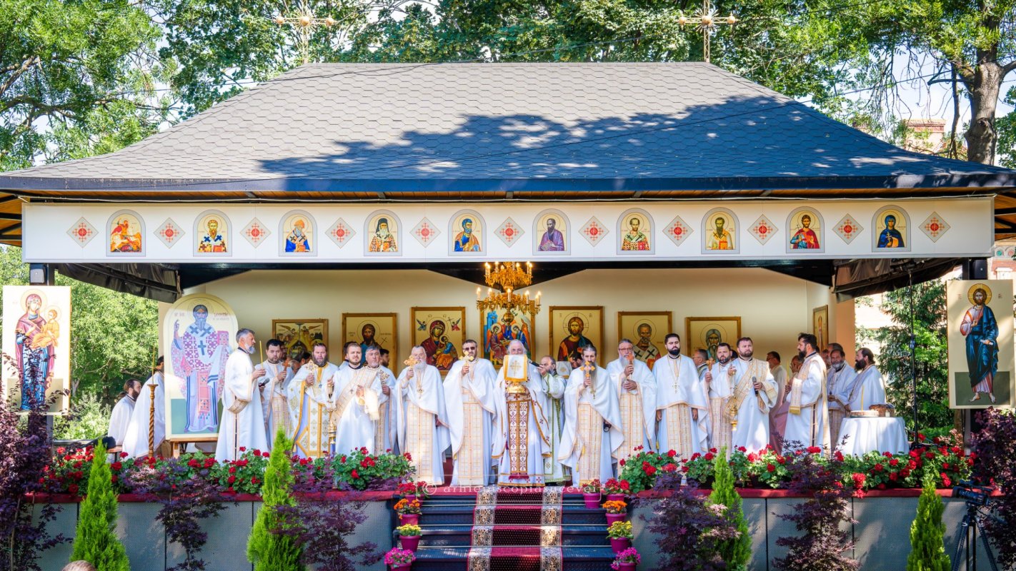 După închinarea la racla cu cinstitele moaște ale Sfinților Ierarhi Leontie de la Rădăuți și Teodosie de la Brazi, așezată într-un baldachin special împodobit cu crini albi și flori sângerii, lângă muzeul Mănăstirii Bogdana, soborul de slujitori a săvârșit, sub protia părintelui arhim. Melchisedec Velnic, exarh al mănăstirilor din Arhiepiscopia Sucevei și Rădăuților și starețul Mănăstirii Putna, Sfânta Liturghie, la Altarul de vară al lăcașului monahal, sub coroana falnicilor stejari.