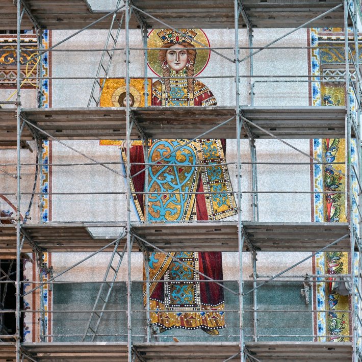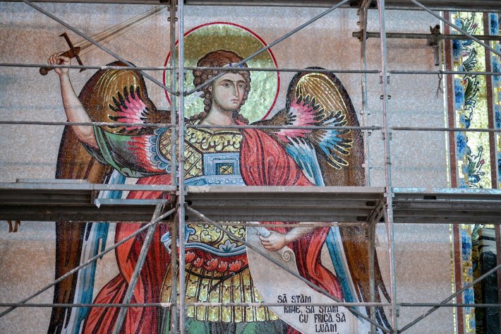 Despre specificul veșmântului iconografic al registrului dintre naos și pronaos ne-a vorbit pictorul Daniel Codrescu, coordonatorul lucrărilor de mozaic, care a arătat cum eforturile actuale ale echipei sale conturează tot mai clar expresia artistică și liturgică a ansamblului: „În momentul de față lucrăm la pilastrul peretelui de nord dintre naos și pronaos, unde încercăm să finalizăm montajul mozaicului din această zonă. Până la Paști, sperăm să avansăm destul de mult și cu pilastrul sudic, unde sunt reprezentați în general sfinți martiri, dar și sfinții cuvioși, printre care se numără Sfânta Cuvioasă Parascheva și Sfântul Cuvios Dimitrie cel Nou, dar și cei doi Arhangheli, Mihail și Gavriil, care vor fi ca doi străjeri ce apără intrarea în naosul bisericii. Mai sus, sunt reprezentați sfinți foarte importanți ai Bisericii. Pe partea de sud, Sfânta Ecaterina, Sfânta Filofteia, Sfânta Varvara, Sfânta Irina, care nu trebuie să lipsească din nici o biserică și care au un loc privilegiat în cadrul acestui ansamblu. Pe peretele de nord, vor fi reprezentați sfinți doctori fără de arginți și mucenici. După perioada pascală vom începe să lucrăm la scenele Adormirii Maicii Domnului și Nașterii Maicii Domnului de pe pereții de nord și de sud, iar ulterior sperăm să putem demara lucrările la peretele de vest care va avea reprezentate cele șapte Sinoade Ecumenice și tablourile votive, dar și la cafas, unde sperăm să avem o iconografie prin care vor fi reprezentate Soborul Tuturor Sfinților, Facerea lumii și Scara virtuților. Între timp, am reușit să finalizăm pictarea veșmântarului din spatele Altarului, un spațiu destul de amplu unde au fost reprezentați sfinți ierarhi”.
