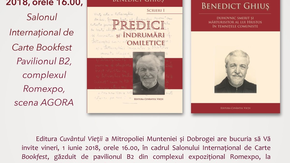 Editura „Cuvântul Vieții” a Mitropoliei Munteniei și Dobrogei participă în premieră la cea de-a 13-a ediție a Salonului Internațional de Carte Bookfest București, pavilionul B2 al Complexului Expozițional Romexpo, în perioada 30 mai - 3 iunie. Cu acest prilej, vineri, 1 iunie, începând cu ora 16:00, pe scena AGORA vor fi lansate două lucrări: Arhimandrit Benedict Ghiuș, „Scrieri I. Predici și îndrumări omiletice” și „Părintele Benedict Ghiuș - duhovnic smerit și mărturisitor al lui Hristos în temnițele comuniste”. Seria „Benedict Ghiuș” a Editurii „Cuvântul Vieții” este coordonată de Preasfințitul Părinte Timotei Prahoveanul, Episcop-vicar al Arhiepiscopiei Bucureștilor. Lansarea de carte va fi moderată de pr. conf. univ. dr. Gheorghe Holbea, în prezența coordonatorului colecției.