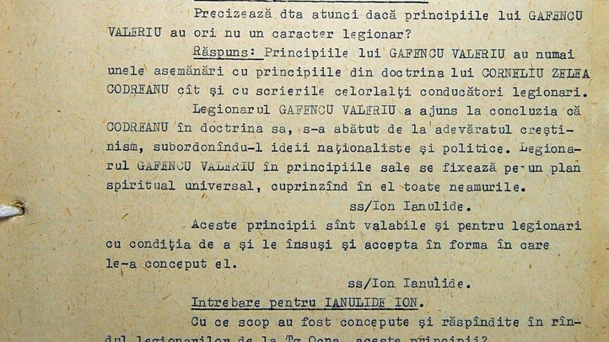 La întrebarea anchetatorului: „Cu ce scop aceste principii au fost concepute și răspândite în rândul legionarilor de la Târgu Ocna?", Ianolide a răspuns: „Aceste principii au fost concepute și răspândite în rândul celorlalți deținuți din Penitenciarul Târgu Ocna, printre care și legionari, cu scopul ca ei să cunoască starea de conștiință a lui Gafencu Valeriu, putând și ei să o adopte în viață”. (Va urma)
