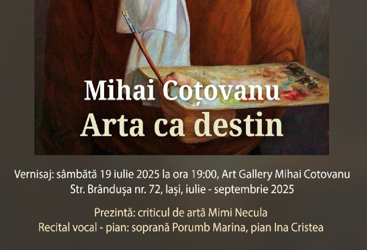 La Art Gallery „Mihai Coțovanu” din Iași va avea loc sâmbătă, 19 iulie 2025, începând cu ora 19:00, vernisajul expoziției „Arta ca destin”, prezentat de criticul de artă Mimi Necula din București. În continuarea evenimentului se va desfășura un recital artistic susținut de soprana Marina Porumb și Ina Cristea la pian.