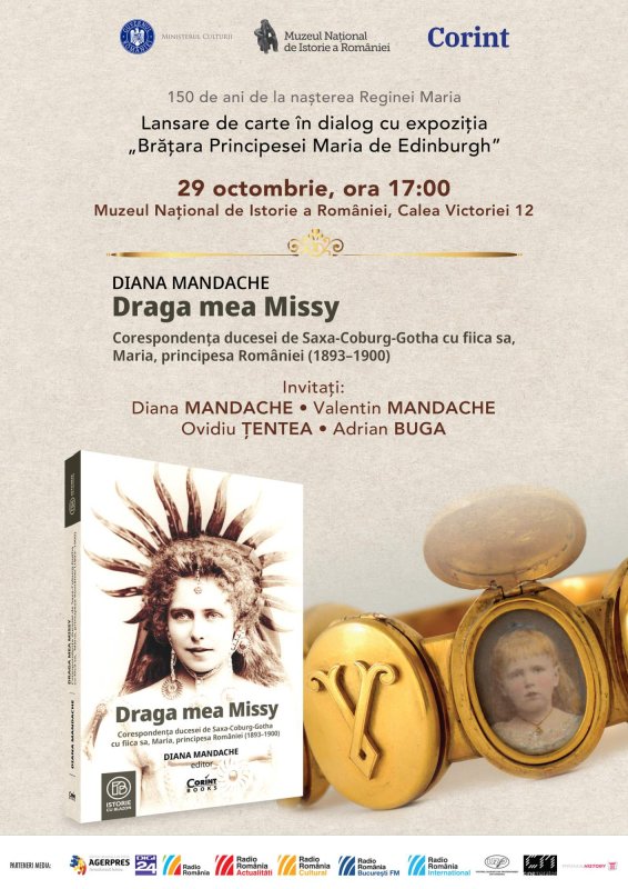 La sediul Muzeului Național de Istorie a României (MNIR) va avea loc, în 29 octombrie 2025, de la ora 17:00, lansarea volumului „Draga mea Missy - Corespondența ducesei de Saxa-Coburg-Gotha cu fiica sa, Maria, principesa României (1893–1900)”, o apariție editorială- eveniment semnată de istoricul Diana Mandache și publicată la Editura Corint.