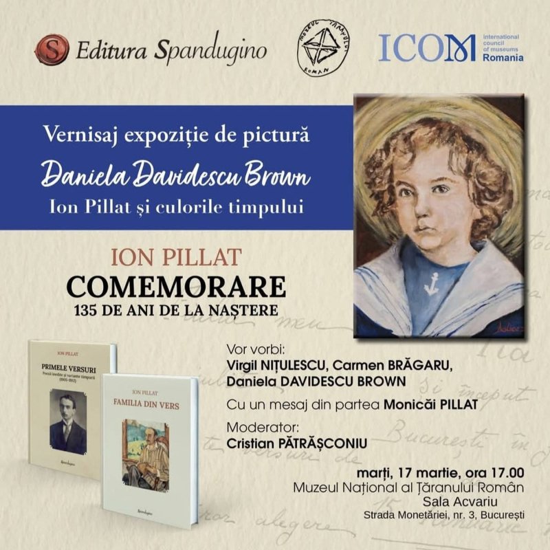 Expoziția de pictură „Ion Pillat și culorile timpului”, aparținând artistei plastice Daniela Davidescu Brown, va avea vernisajul în seara aceasta, 17 martie, la ora 17:00, la Muzeul Național al Țăranului Român, în Sala Acvariu. Amfitrionul evenimentului va fi Virgil Ștefan Nițulescu, directorul general al muzeului. Discuțiile se vor axa pe evocarea personalității poetului Ion Pillat, de la a cărui naștere se vor împlini, la 31 martie, 135 de ani. Vor lua cuvântul Carmen Brăgaru, cercetător în cadrul Institutului de Istorie și Teorie Literară „G. Călinescu” din București, și Daniela Davidescu Brown, moderator fiind Cristian Pătrașconiu, jurnalist cultural, care va citi un mesaj din partea Monicăi Pillat. Participanții vor putea achiziționa volumele recent publicate de Editura Spandugino din opera lui Ion Pillat, „Familia din vers” și „Primele versuri. Poezii inedite” și variante timpurii (1905-1912), precum și cărți de poezii și proză semnate de Monica Pillat.