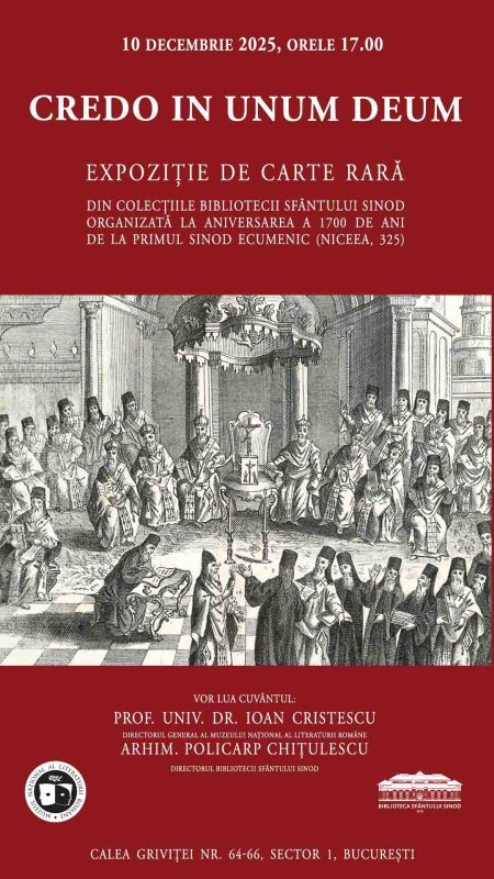 Muzeul Național al Literaturii Române (MNLR) organizează, în parteneriat cu Biblioteca Sfântului Sinod, expoziția „Credo in unum Deum”, care cuprinde cărți rare din colecțiile Bibliotecii Sfântului Sinod. Se celebrează astfel 1.700 de ani de la Primul Sinod Ecumenic, desfăşurat la Niceea, în anul 325. Vernisajul va avea loc mâine, 10 decembrie, ora 17:00, la sediul MNLR din Calea Griviței 64-66. Vor lua cuvântul prof. univ. dr. Ioan Cristescu, directorul general al MNLR, și arhim. Policarp Chițulescu, consilier patriarhal, directorul Bibliotecii Sfântului Sinod. Expoziția va fi deschisă până în 31 decembrie 2025. (A.D.)
