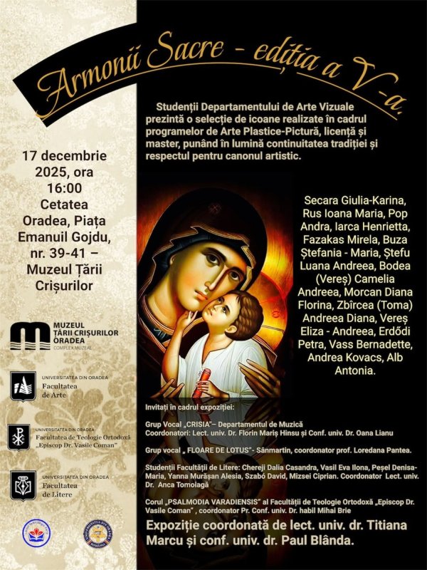 Secția Muzeului Orașului Oradea din Cetatea Oradea, găzduieşte azi, 17 decembrie 2025, de la ora 16:00, a V-a ediție a expoziției „Armonii sacre”, realizată de studenții programelor de studiu de licență Arte Plastice - Pictură și de master Arte Plastice și Multimedia, din cadrul Departamentului de Arte Vizuale al Facultății de Arte, Universitatea din Oradea.