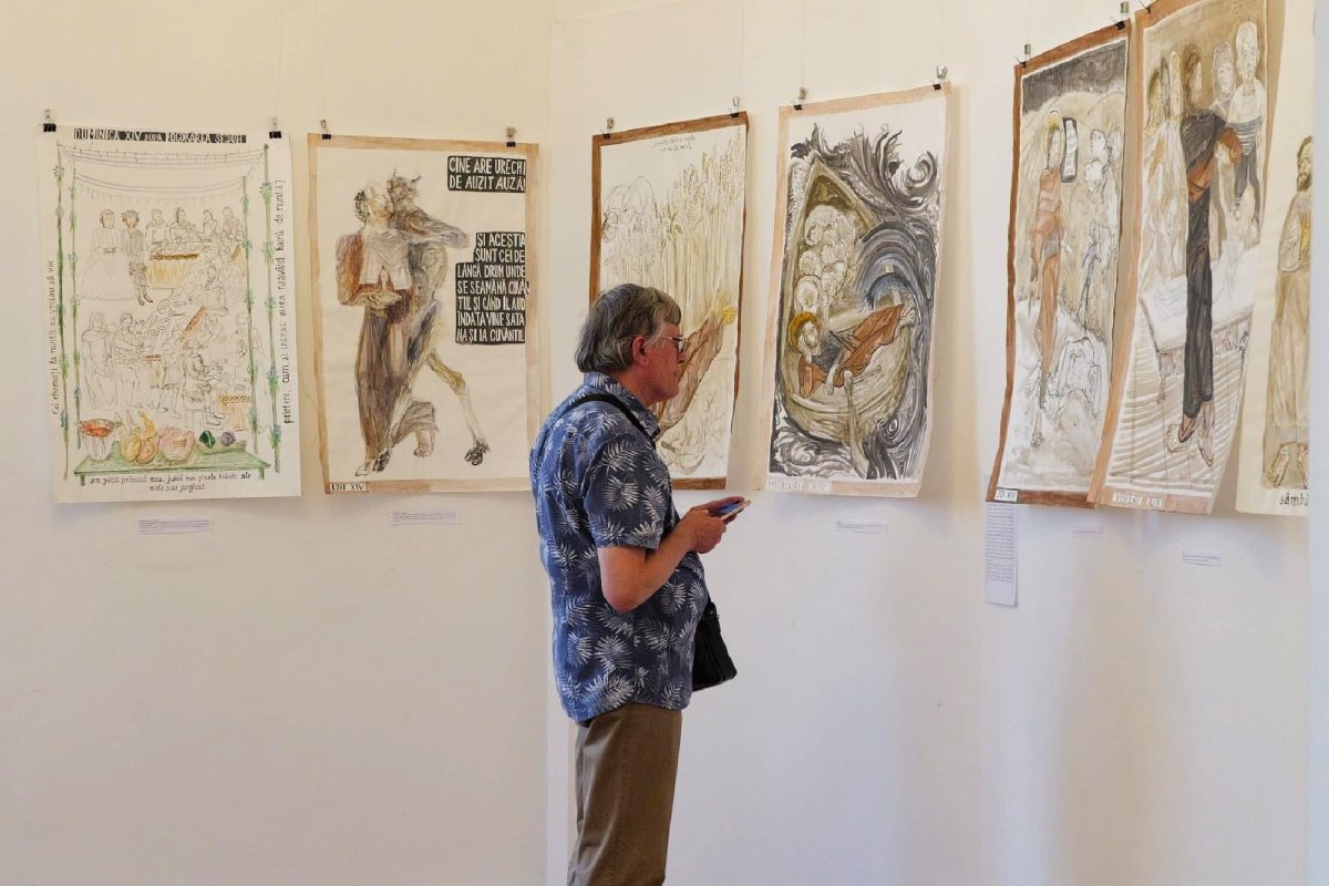 „(…) Un întreg are 7 fragmente, 7 zile, care au legătură între ele și cu viața ritmată de sfârșitul și reînceputul muncii, duminică/luni. Sunt ca proiecte de pictură monumentală pe hârtie, pentru că seamănă cu peretele de var, măresc desenul în creion al schițelor și redesenează cu pensula desenul cu care încep pe hârtia mare. Nu sunt icoane, unde subiectul e știut și cere lucrul cu răbdare. Aici lucrul este concentrat pe imaginea interioară și pe desen, să nu le pierd lucrând la definirea realului și, deci, uneori nu e dus până la capăt. Sau alături de imagine, pornind de la text, izvodind încă un text pentru mine ca privitor, în afara textelor-titluri”, a spus artistul.