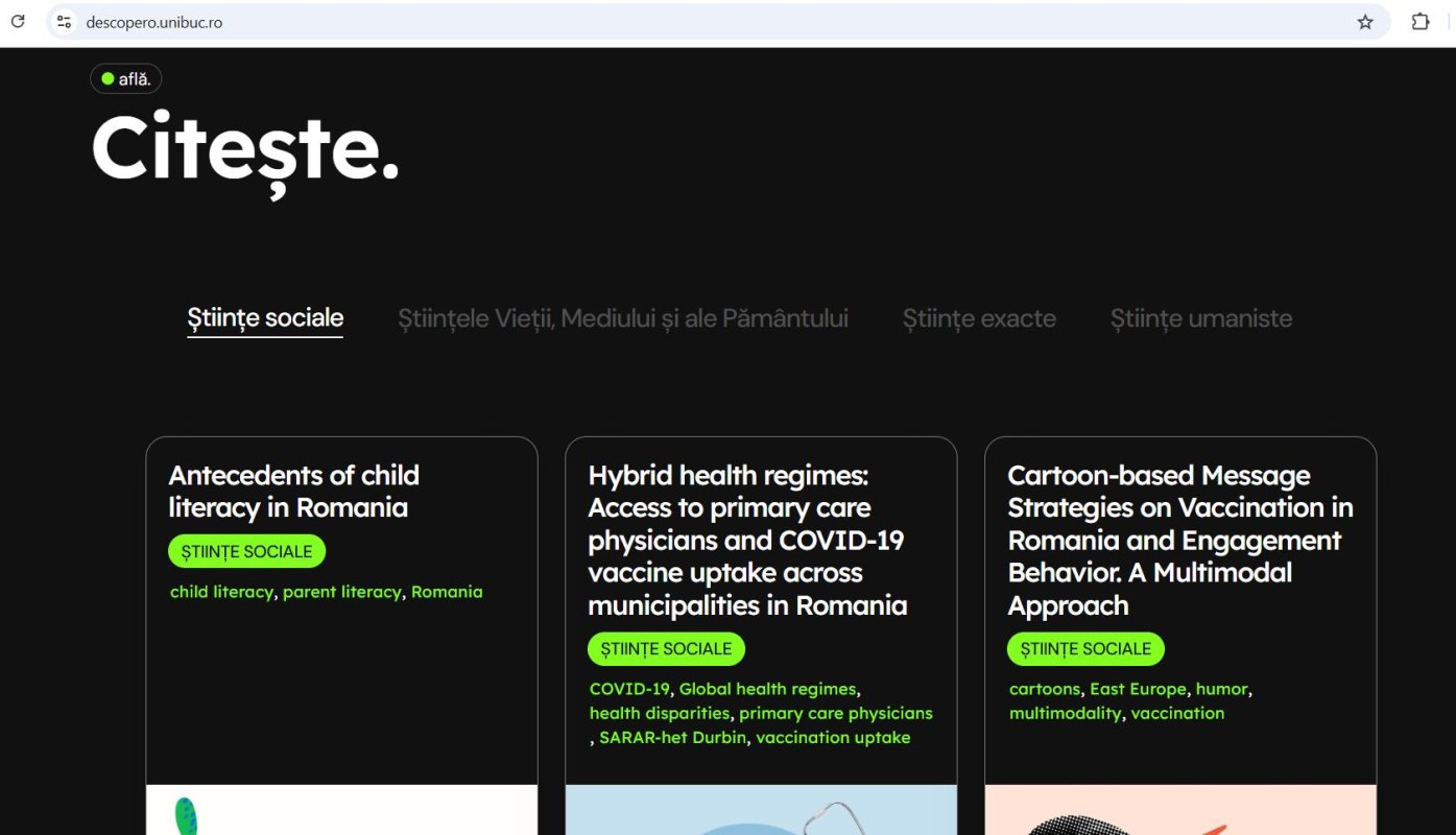 Universitatea din Bucureşti (UB) a lansat proiectul descopeRO.unibuc.ro, „o platformă care îşi propune să prezinte activitatea cercetătorilor din cadrul instituţiei de învăţământ superior într-o formă cât mai accesibilă şi utilă comunităţii”. „DescopeRO.unibuc.ro este un instrument de comunicare a ştiinţei, transparent, accesibil şi orientat spre public, care reuneşte proiecte de cercetare, publicaţii şi rezultate ştiinţifice relevante, facilitând astfel diseminarea cunoştinţelor generate la UB şi stimulând dialogul între comunitatea academică, decidenţi, mediul public şi societatea civilă”, se arată într-un comunicat citat de Agerpres. De exemplu, pe platforma UB pot fi consultate rezultatele unui studiu care investighează multiple antecedente ale alfabetizării la copii, precum datele demografice, comportamentul de lectură al copiilor, comportamentul de lectură al părinților și contextul familial. (O.N.)