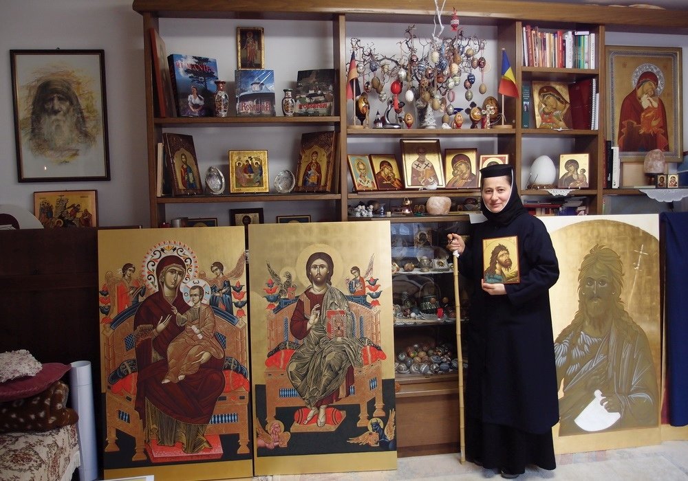 Trăind în Germania de 25 de ani și fiind egumena Mănăstirii „Sfinților Martiri Brâncoveni” din cadrul Mitropoliei Ortodoxe Române din Nürnberg, mă cunosc aproape toți preoții români din diaspora. M-au solicitat de multe ori să merg să pictez în parohiile lor. La început am lucrat destul de mult și în foarte multe parohii românești din Germania. Chiar dacă preoții noștri nu au biserici proprii, fiecare, în biserica în care slujește, a căutat să-și asambleze un iconostas mobil. Și atunci, noi, din partea mitropoliei, am căutat să-i ajutăm cu acest lucru, unde s-a putut și cum am putut. La Stuttgart am pictat iconostasul în întregime, acolo fiind biserica noastră cumpărată. La Tübingen, iarăși am pictat în întregime, doar câteva icoane le-a pictat înainte alt pictor, care nu a mai putut continua lucrarea.
