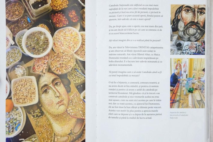 Tipărit în condiții grafice excepționale, volumul dă mărturie despre modul în care ia naștere veșmântul plin de măreție al Catedralei Naționale, dar și despre talentul, inspirația și jertfa celor care lucrează în general 12 ore pe zi pentru ca, așezând cu răbdare teseră cu teseră, să ne aducă tuturor în suflet la vederea chipurilor sfinte iubirea de Dumnezeu și dorința de rugăciune.