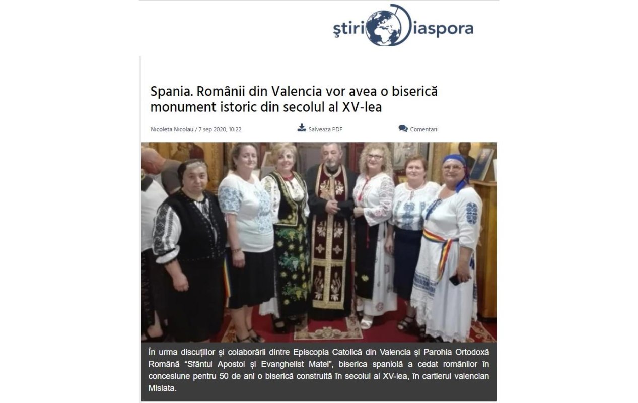 Știri diaspora anunță că românii din Valencia vor avea o biserică monument istoric din secolul al XV-lea, după ce, în urma discuțiilor și a colaborării dintre Episcopia Catolică din Valencia și Parohia ortodoxă română „Sfântul Apostol și Evanghelist Matei”, spaniolii au acordat românilor, în concesiune pentru 50 de ani, un locaș de cult construit în secolul al XV-lea, din cartierul Mislata. Românii au depus deja actele necesare obținerii avizelor pentru renovare. „Acest acord este un pas foarte important pentru românii din Valencia, pentru că vom avea o biserică, nu un spațiu renovat și transformat într-un locaș de cult. Îl vom avea pentru 50 de ani, nu vom mai plăti chirie și va fi în scurt timp un loc minunat pentru rugăciune”, a declarat părintele Gabriel Cojocaru, coordonatorul proiectului, pentru Știrile TVR. Preotul slujește în Spania de peste 17 ani și spune că biserica este a doua casă pentru români, acolo unde vin să se roage pentru mai bine, pentru a se căsători, boteza copiii sau petrece pe ultimul drum pe cei care pleacă dintre noi.