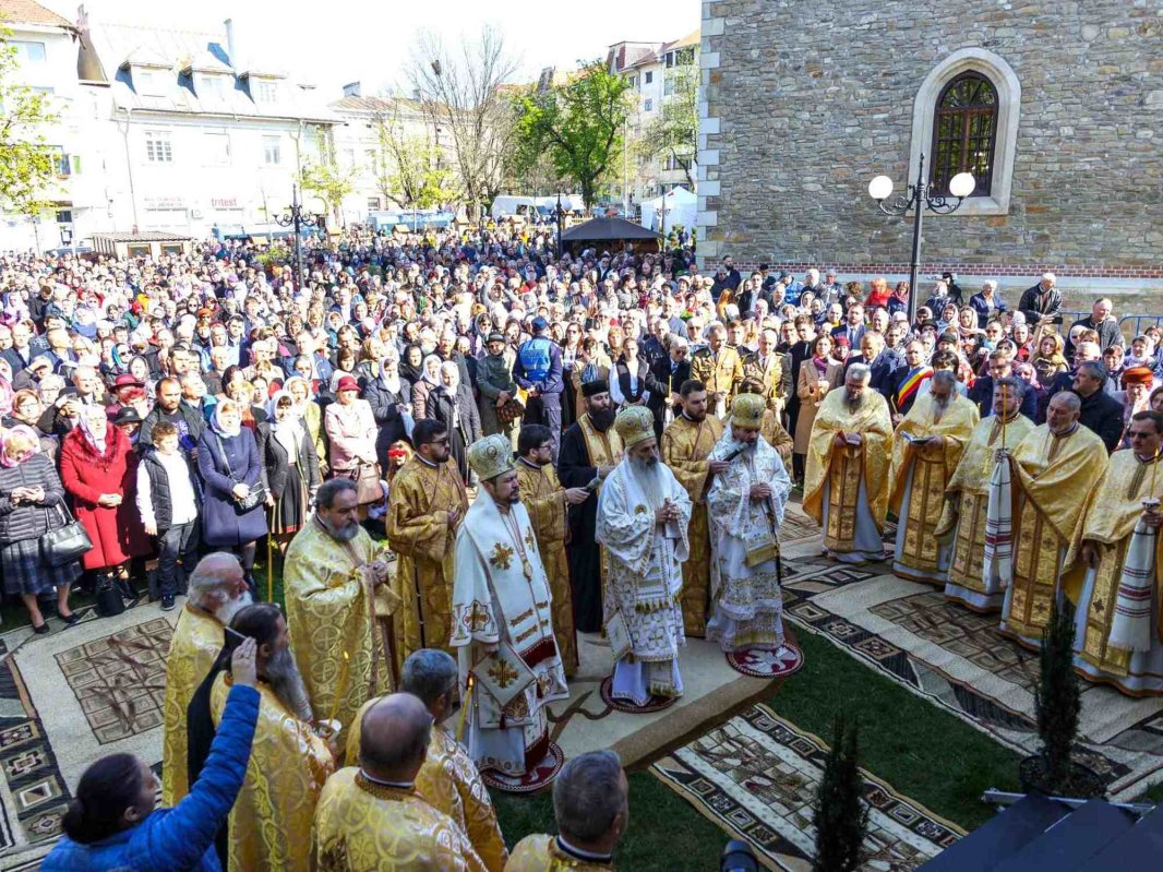 IPS Părinte Teofan, Mitropolitul Moldovei și Bucovinei, înconjurat de ierarhi, preoți și diaconi, slujind la hramul Bisericii „Sfântul Gheorghe“ din Botoșani, în anul 2023