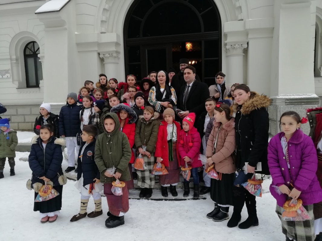 Primăria Deleni, prima oprire cu colinda a Grupului vocal „Hurgheşelul”, coordonat de doamna învăţătoare şi preoteasă Iulia Fotea