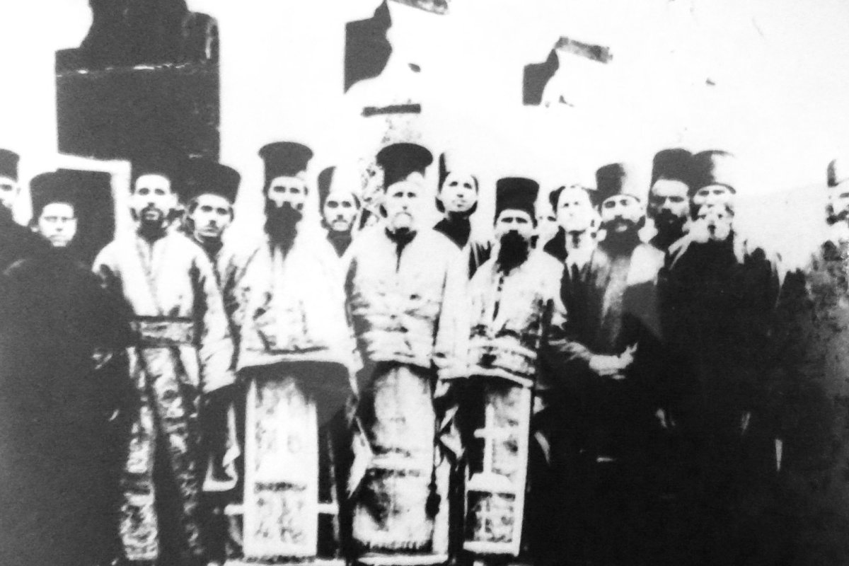 Cuviosul protoschimonah Visarion Toia, stareț al sfintei Mănăstiri Lainici în perioada 1929-1951, în mijlocul părinților și fraților mănăstirii