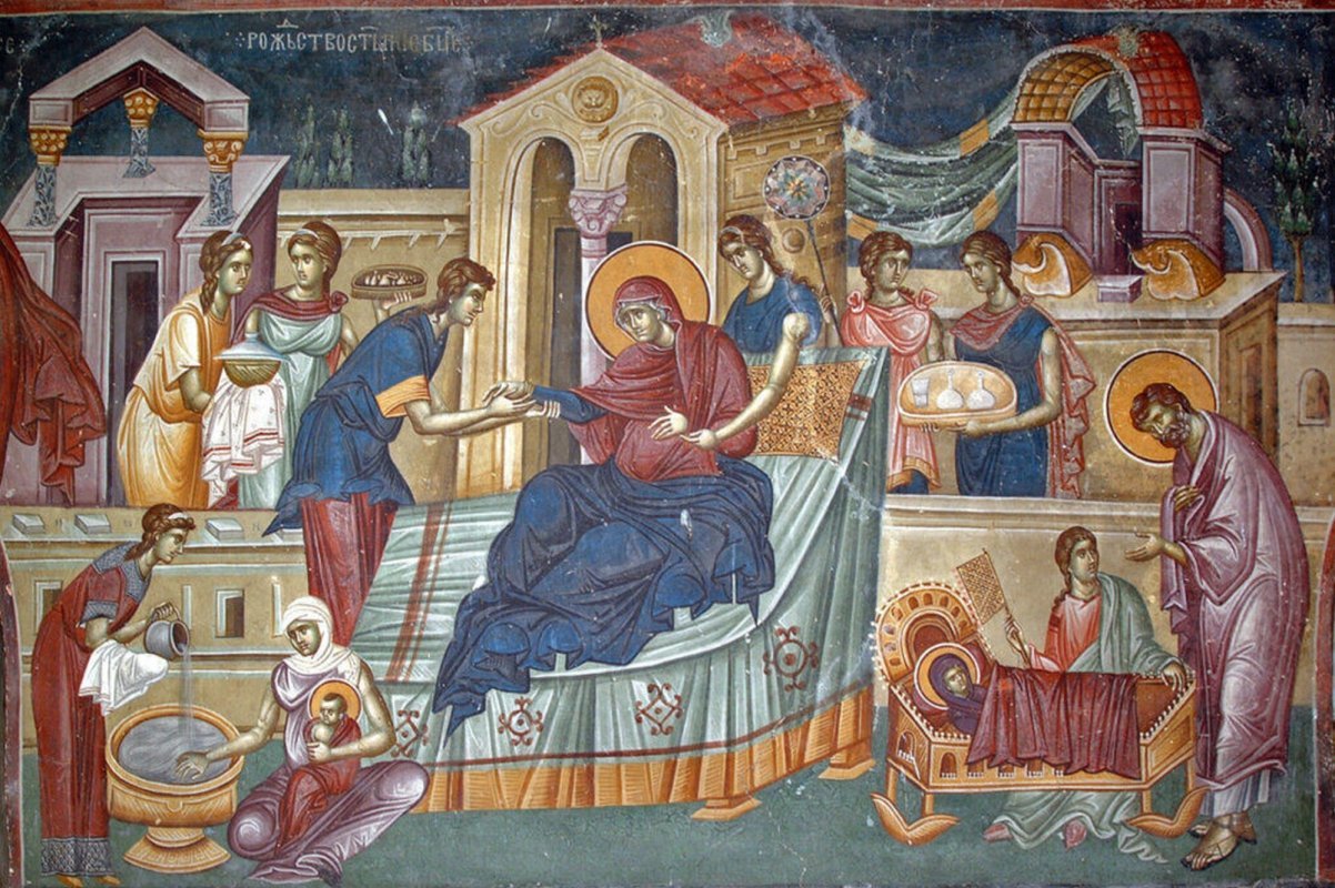 Interesantă este icoana sărbătorii, care, la o primă vedere, aduce destul de mult cu icoana Nașterii Domnului. Aparent, seamănă. Însă sunt multe deosebiri, în formă și conținut. În primul rând, în icoana așa cum este ea reprezentată tradițional, este foarte multă foială. Un cârd de oameni - așa cum apar spre exemplu la Teofan Cretanul (sec. 16) - intră și ies din cadru, iar pe lângă cele trei personaje centrale (Sf. Ana șezând pe patul lăuziei, privind pieziș, Sf. Ioachim la capul patului căzut pe gânduri - poate în rugăciune de mulțumire? - și micuța Maria în colțul din dreapta jos, în brațele unei doici) răsar alți chibiți din rândul unor pâlcuri de femei care vorbesc. Despre ce? Despre această minunată și surprinzătoare naștere, despre condiția copilului, despre starea de „răpire” a tatălui. Și, desigur, despre vârstnica mamă care a adus pe lume o fetiță așa frumoasă și sănătoasă. Despre Dumnezeu or fi vorbind, oare? În mod cert, despre cum Yahweh s-a milostivit de cei doi necăjiți, trimițându-le un copil spre alinare sufletească și redresare socială. Toată dinamica natalității, toate acțiunile unor moașe dedicate sunt surprinse în cadru, însă nimic nu amintește de marea mirare de pe chipul Maicii Domnului la nașterea lui Iisus. Nimic nu aduce cu staulul vitelor, cu precaritatea sălașului, cu frigul mușcător de afară, cu absența unor ajutoare. Cu alte cuvinte: Fecioara însăși s-a născut omenește, printre oameni, într-o familie așezată, cu reguli bine stabilite. Iisus însă, Dumnezeu și om, a avut parte de o naștere într-un cu totul alt context. Da, dar îi uităm pe magi, care I-au adus daruri bogate fără să-L cunoască, și pe păstori, care au început să cânte din senin, laolaltă cu îngerii. Așadar, om a fost acela? Sau numai om...?