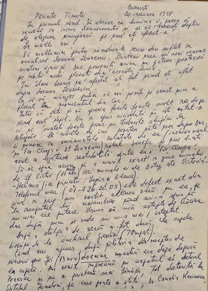 Întâi să știți că vă aprecia foarte foarte mult încă de pe când erați copil. Nu a spus niciodată că ați uitat‑o, ci că sunteți foarte prins cu treburile slujirii la Mitropolie. De multe ori îmi povestea câte ceva despre dumneavoastră și cunosc în amănuntele relatate de ea (inclusiv visul cu Părintele Cleopa și Domnul Lovinescu) rolul benefic pe care l‑ați avut în legătura restabilită dintre ea și Părintele Cleopa.