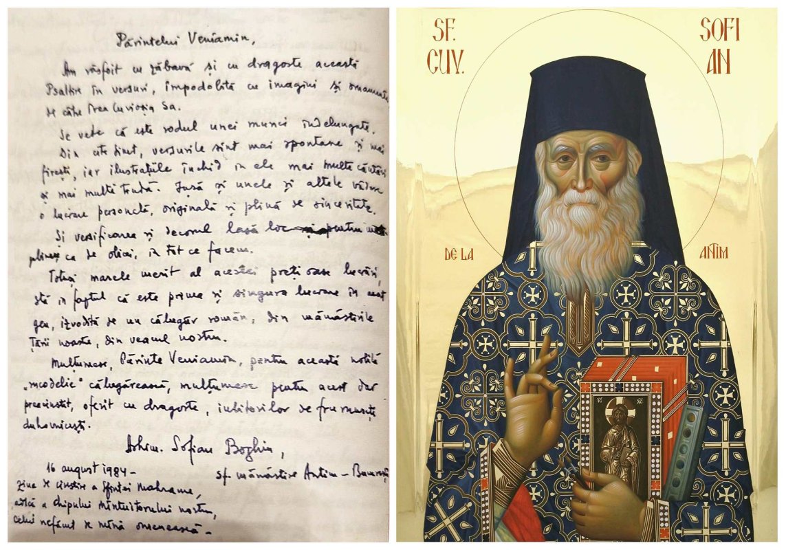 Câțiva ani mai târziu, în 1984, la sărbătoarea Sfintei Mahrame, Părintele Sofian îi trimitea următoarea scrisoare: „Am răsfoit cu zăbavă și cu dragoste această Psaltire în versuri, împodobită cu imagini și ornamente de către Preacuvioșia Ta. Se vede că este rodul unei munci îndelungate. Din câte simt, versurile sunt mai spontane și mai firești, iar ilustrațiile închid în ele mai multe căutări și multă trudă. Însă și unele și altele vădesc o lucrare personală, originală și plină de sinceritate. Marele merit al acestei prețioase lucrări stă în faptul că este prima și singura de acest fel, izvodită de un călugăr român în mănăstirile țării noastre, în veacul al XX-lea. Mulțumiri, Părinte Veniamin, pentru această nobilă rodire călugărească, pentru acest dar preacinstit oferit iubitorilor de frumuseți duhovnicești”.