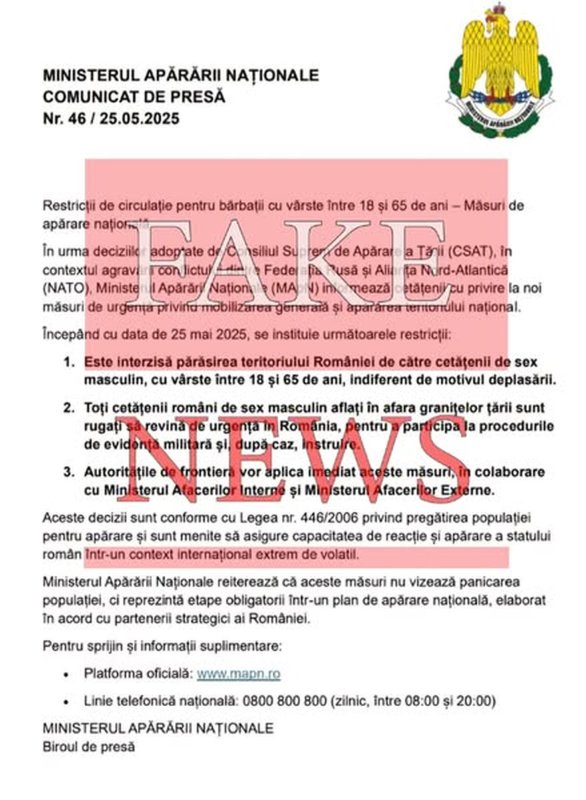 În mediul online continuă campaniile de dezinformare cu privire la subiecte ce ţin de apărarea şi securitatea naţională, mesajele false fiind distribuite pe diferite platforme precum Facebook, TikTok sau Youtube, dar şi pe WhatsApp. „Dezmințim categoric autenticitatea acestui document care anunță restricționarea circulației cetățenilor de sex masculin cu vârste între 18 și 65 de ani, ca urmare a instituirii stării de mobilizare în România. Acesta nu a fost emis de MApN și conține informații false și alarmiste, menite să creeze panică și confuzie în rândul populației”, a transmis Ministerul Apărării Naţionale. Tot fals este şi mesajul potrivit căruia SUA au decis „retragerea totală a militarilor americani dislocați în România”. (O. N.)