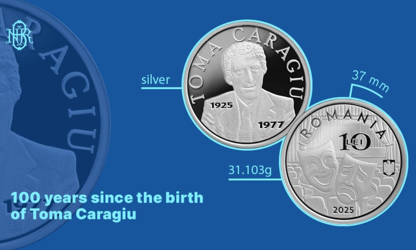 Banca Naţională a României a lansat în circuitul numismatic, în 22 septembrie 2025, o monedă din argint cu tema 100 de ani de la naşterea lui Toma Caragiu. Pe aversul monedei este prezentată o compoziţie reprezentând arta teatrală, iar pe revers este redat portretul, numele lui Toma Caragiu şi anii în care a trăit: 1925 şi 1977. Preţul de vânzare al monedei este 620,00 lei, exclusiv TVA, şi include broşura de prezentare şi certificatul de autenticitate.