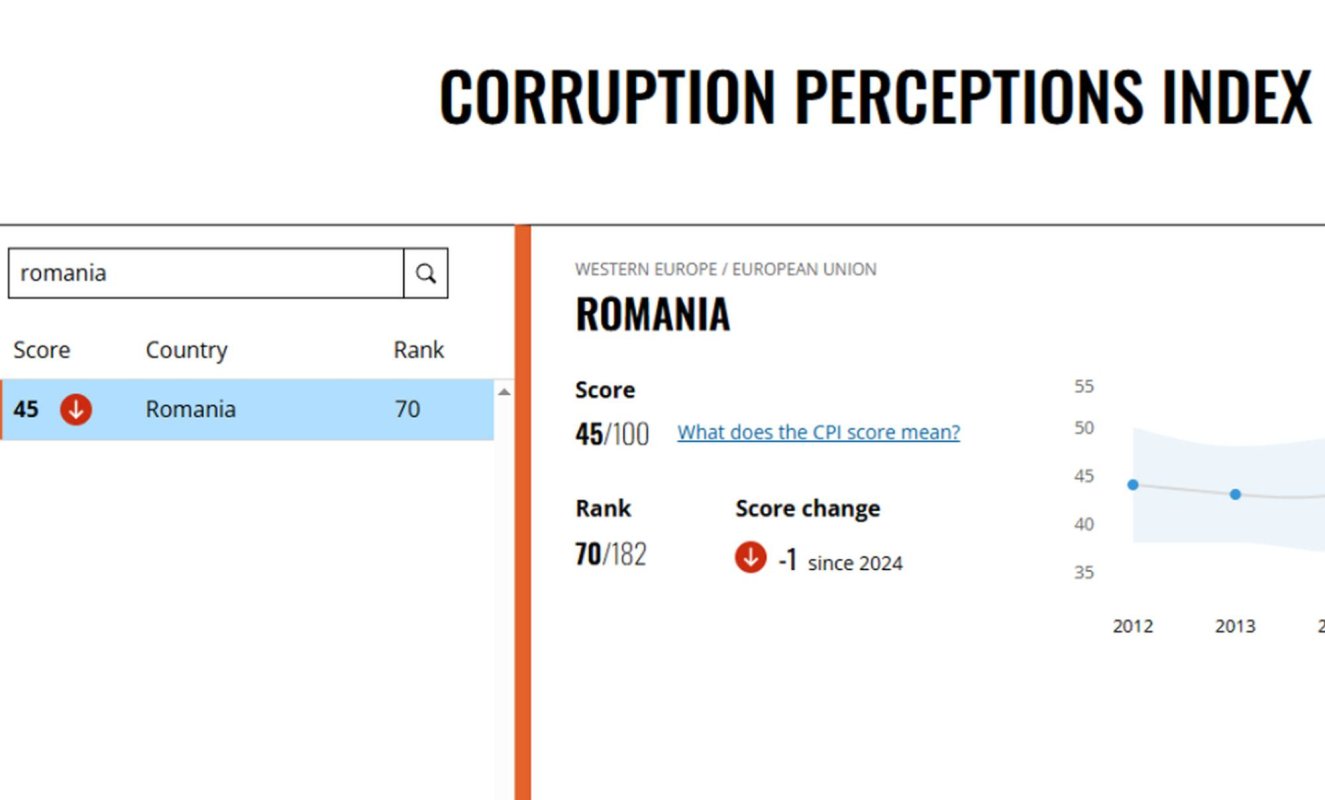 Potrivit Indicelui de Percepţie a Corupţiei (IPC) 2025 lansat marți de Transparency International, corupţia în sectorul public se agravează la nivel global. În clasament, care acordă puncte de la 0 (foarte corupt) la 100 (deloc corupt), țara noastră are 45 de puncte, sub media democraţiilor fragile (47) și sub media UE (62). „România rămâne printre ultimele trei state UE în clasament, alături de Bulgaria (40) şi Ungaria (40)”, potrivit organizației citate de Agerpres. (C.Z.)